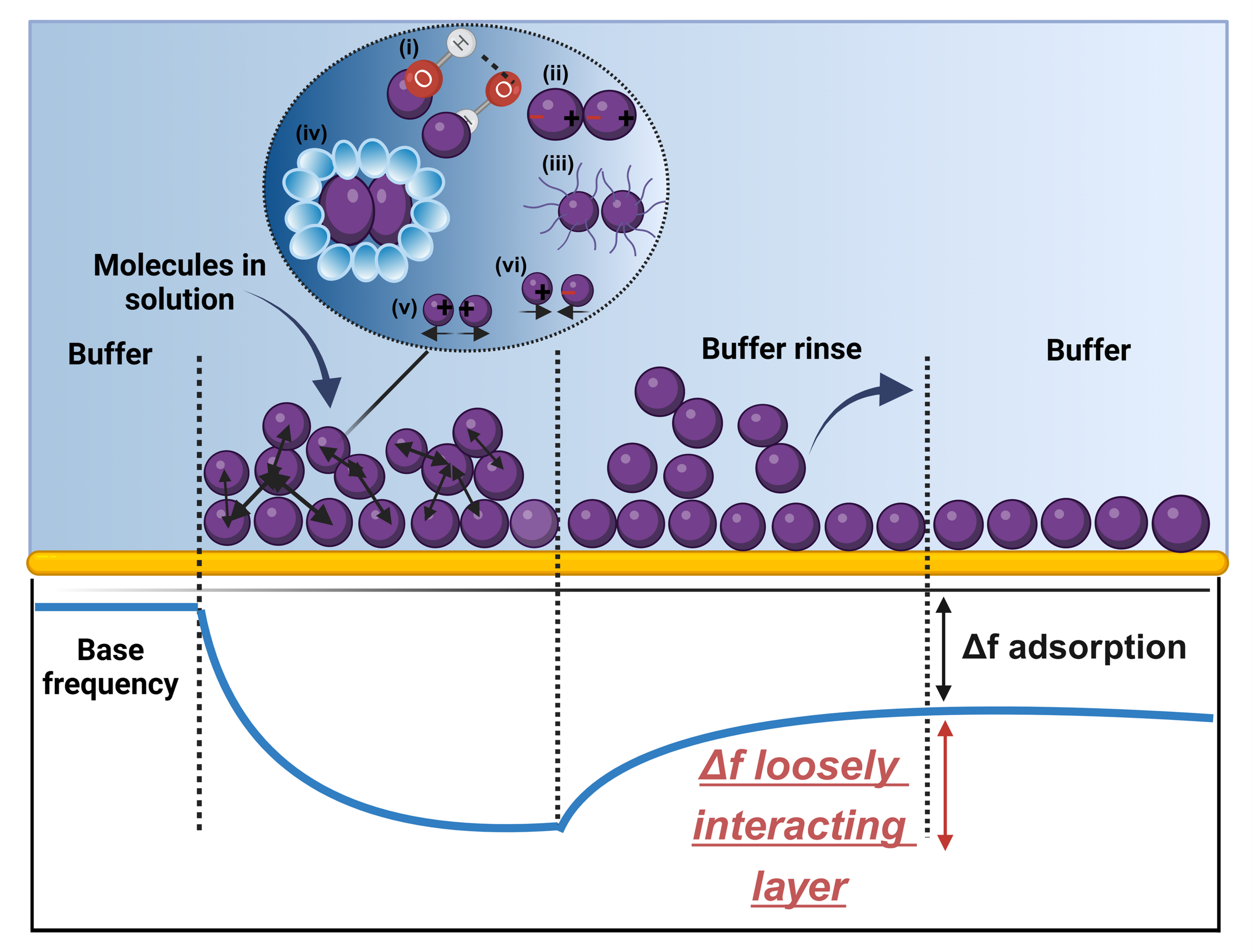 Solution behavior is believed to be governed by protein self-association, however, measurement of these associations experimentally and prediction of the solution behavior are challenging using the current methods. The quartz crystal microbalance with dissipation monitoring (QCM-D) technique often detects a loosely interacting layer on top of the irreversibly adsorbed layer of molecules/particles. In this work, we demonstrate that this layer provides a plethora of information about molecular/particulate self-association and can be used to predict colloidal stability of macromolecular systems and solution behavior of monoclonal antibodies and other proteins. Unlike currently used approaches, this method is capable of measuring the metrics of protein self-association under relevant formulation conditions. In addition, we show that the reliability of this method is significantly superior to that of DLS-based diffusion interaction parameter.